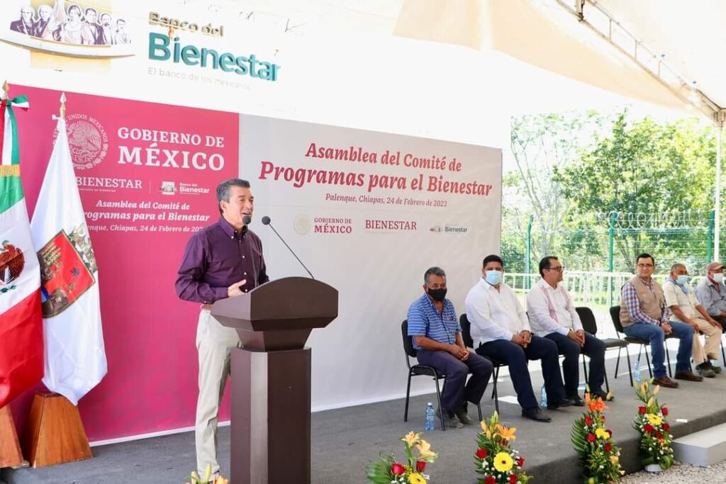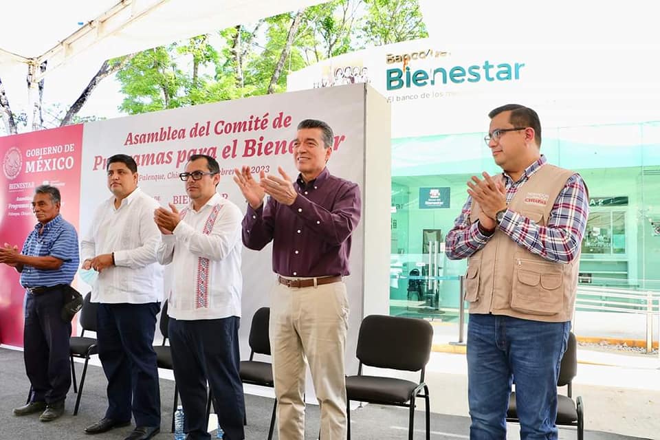 El gobernador Rutilio Escandón Cadenas inauguró la sucursal del Banco del Bienestar en el municipio de Palenque, donde también arrancaron las asambleas de instalación de los Comités de Programas para el Bienestar en sucursales del Banco del Bienestar, los cuales atenderán e informarán de manera directa a las personas beneficiarias de pensiones, becas y programas sociales que otorga el Gobierno de México.