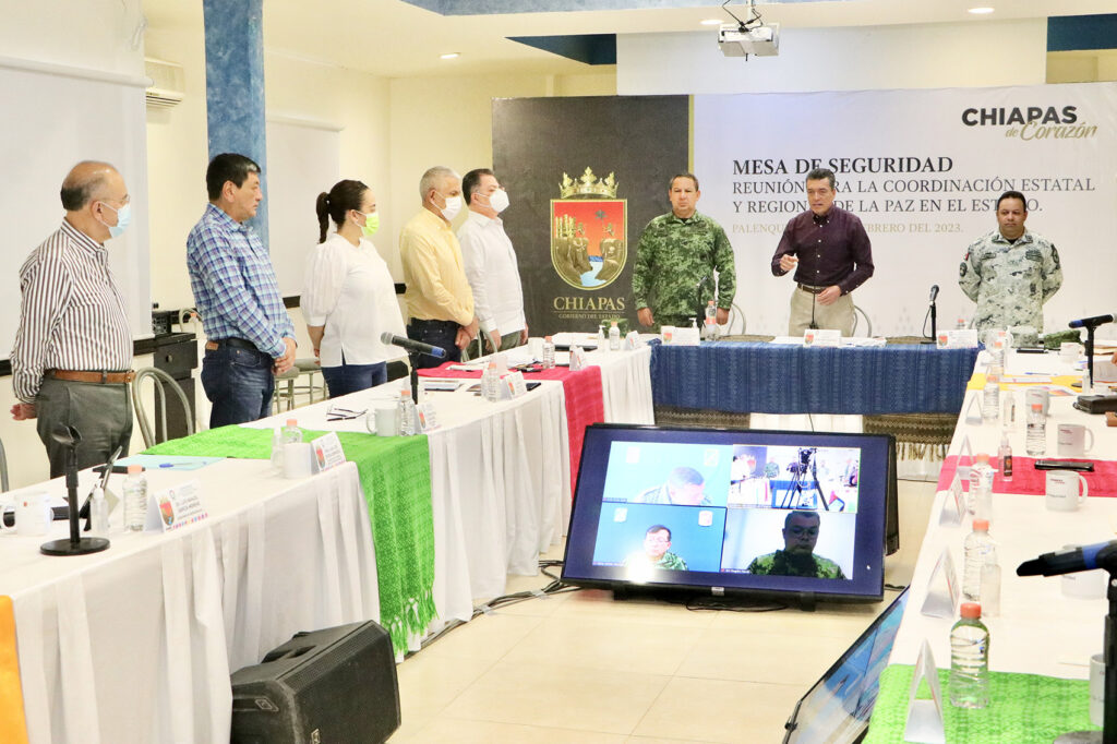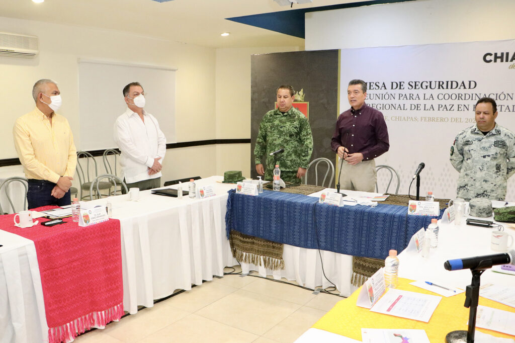 Asistieron: el secretario técnico de la Mesa de Coordinación de Construcción de Paz y Seguridad del Estado, José Francisco Trujillo Ochoa; la representante de Programas Integrales de Desarrollo en Chiapas, Deysi del Carmen Domínguez Damas; el representante de la Secretaría General de Gobierno, Jorge Cruz Pineda; los comandantes de la VII Región Militar, Armando Montaño Ponce; de la 38 Zona Militar, Rubén Darío Díaz Esparza; de la Cuarta Compañía de Infantería No Encuadrada, José Luis Bautista de la Cruz; el coordinador estatal de la Guardia Nacional, Manuel García Morcillo.